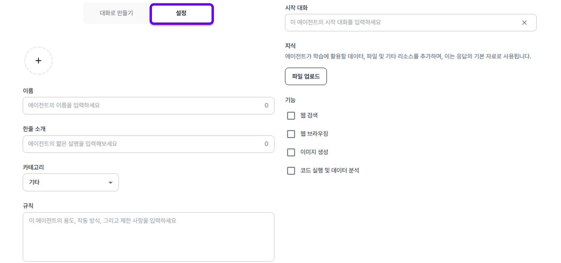 단, 지식과 기능은 사용자가 직접 업로드 및 선택해야 하는 값입니다.