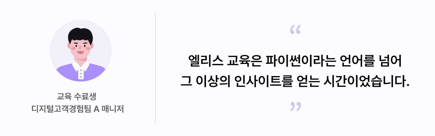 엘리스 교육을 통해 전체적인 개념을 이해하고 데이터를 직접 다뤄볼 수 있었습니다. 단계별로 하나씩 배울 때마다 성취감이 느껴졌고, 앞으로 제대로 할 수 있을 거라는 자신감도 생겼습니다.